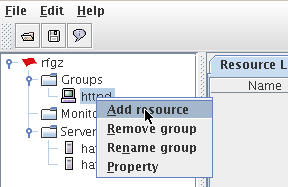 接着,在树形菜单中,选择“Group-httpd”,点击鼠标右键,选择“Add Resources”: