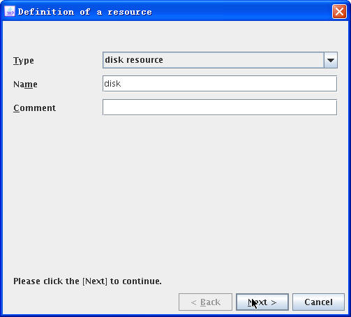 在“Type”一栏中,选择“disk resource”,并给予其一个名称(不能与已有资源重复):