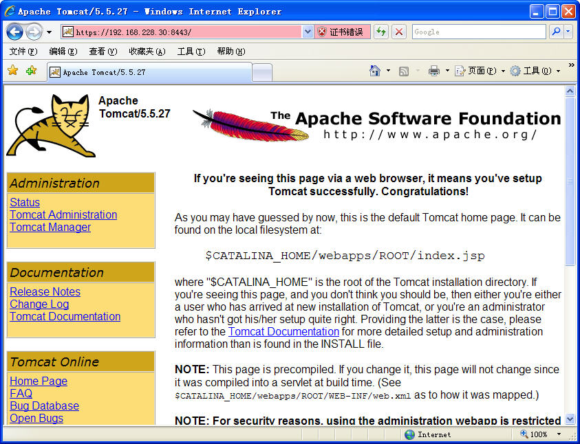 然后,修改/usr/local/tomcat5.5.27/conf/server.xml文件,把原来已经注释SSL的部分取消,也就是激活: