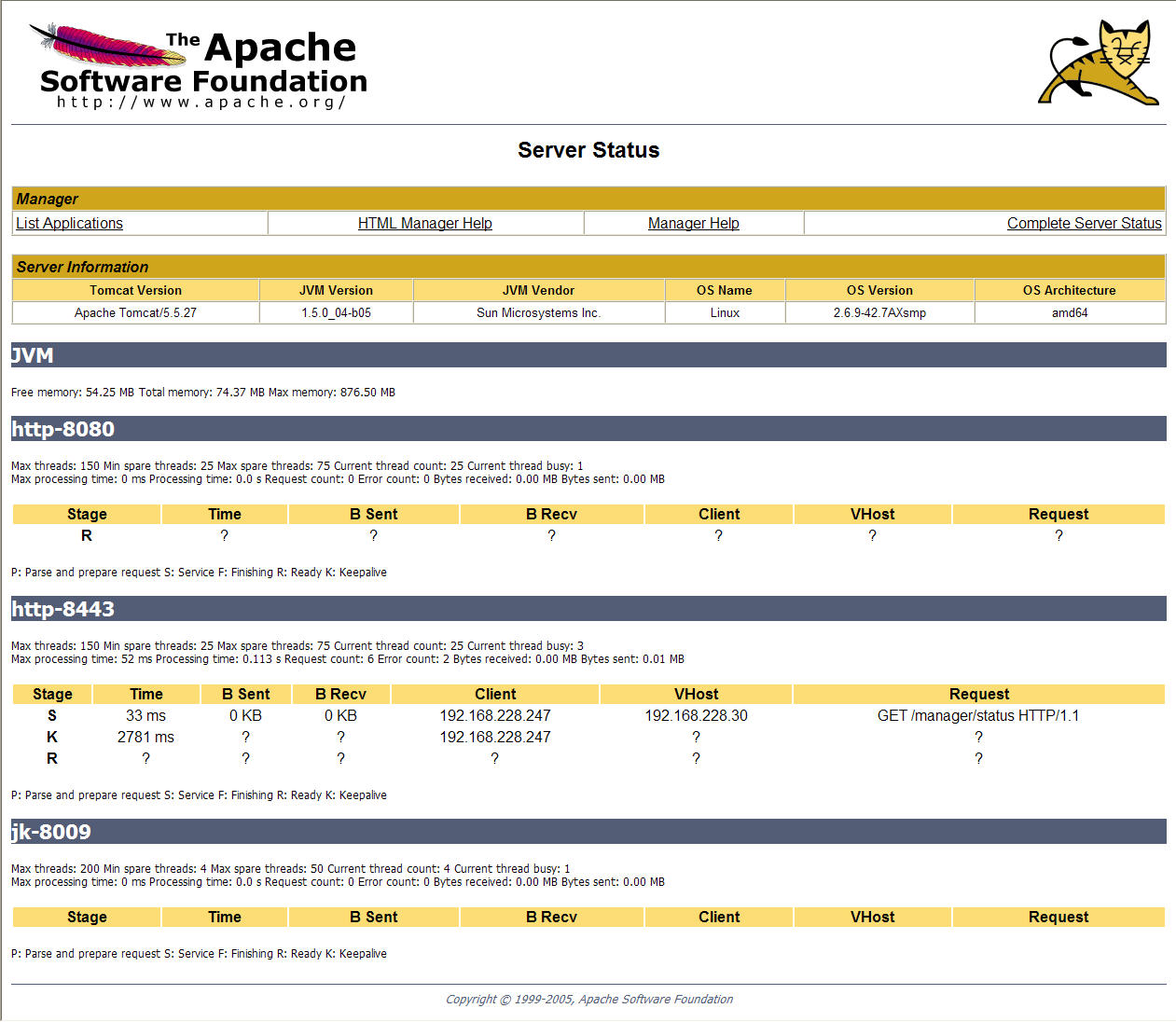 重新启动Tomcat后,输入http://ip:8080/,点击“Status”,输入用户名和密码都是admin,Tomcat状态显示如下:
