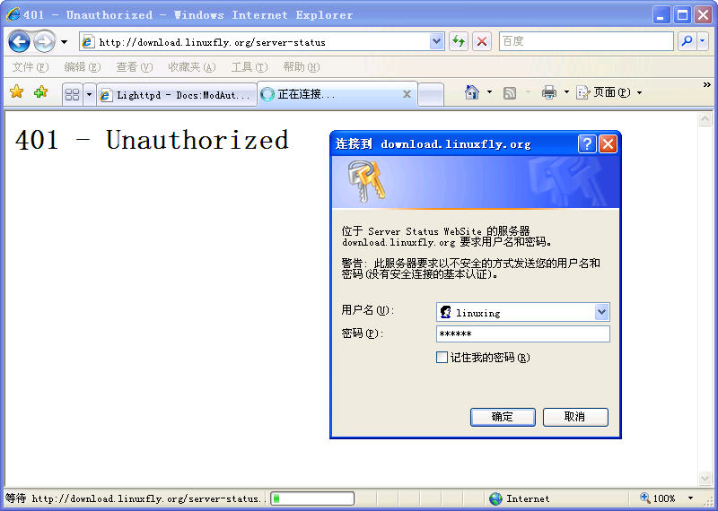 输入正确的用户名(linuxing),密码(abc123)后即可正常访问。否则,会报401错误,error.log日志显示: