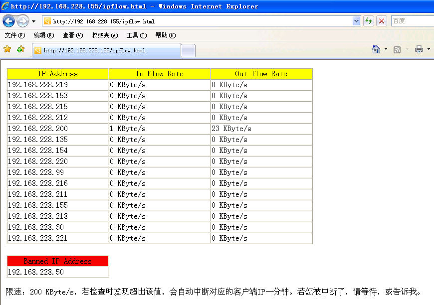 限速:200 KByte/s,若检查时发现超出该值,会自动中断对应的客户端IP一分钟。