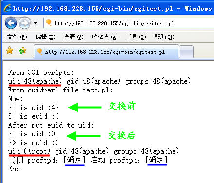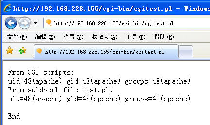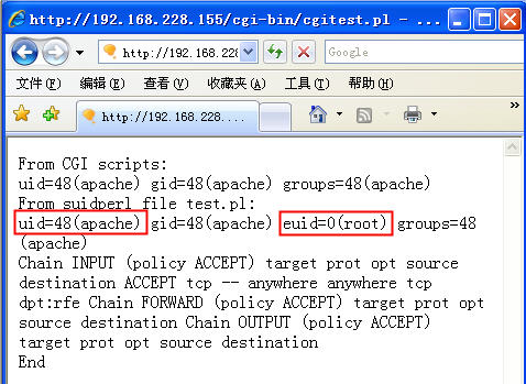 虽然给test.pl赋予了suid权限,但suidperl执行时只是增加了euid的属性,执行用户仍是apache(48)。还不能完全实现root用户的操作。
