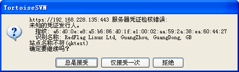 当Subversion命令行客户端选择信任该证书,那么客户端与服务端之间就创建了一个基于SSL的加密传输。之后的访问权限控制等,与简单的HTTP协议方式是完全相同的。