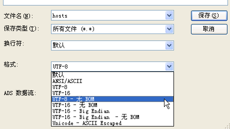 转换的方法有很多,常见的UltraEdit-32或NotePad++都可以,以UltraEdit-32为例。打开文件后,选择“另存为”,在“格式”一栏中有如下选择: