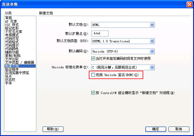 另外,DreamWeaver CS3也有类似的选项,在“首选项”中,如果选择 Unicode (UTF-8) 作为默认编码,则可以选择“包括 Unicode 签名 (BOM)”选项,以在文档中包括字节顺序标记 (BOM)。否则,不带BOM:
