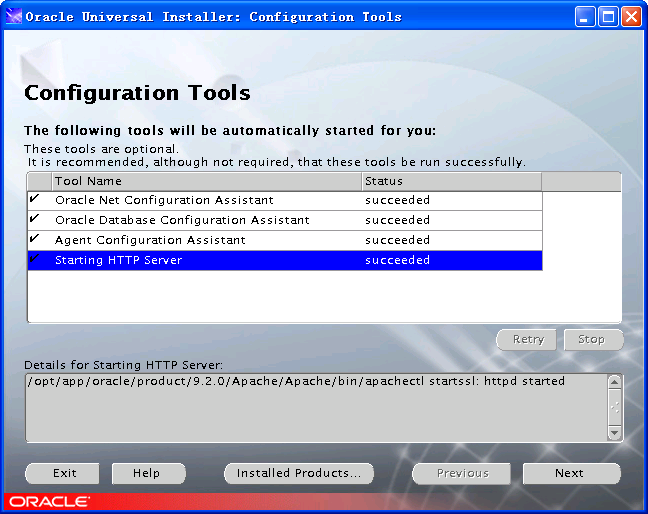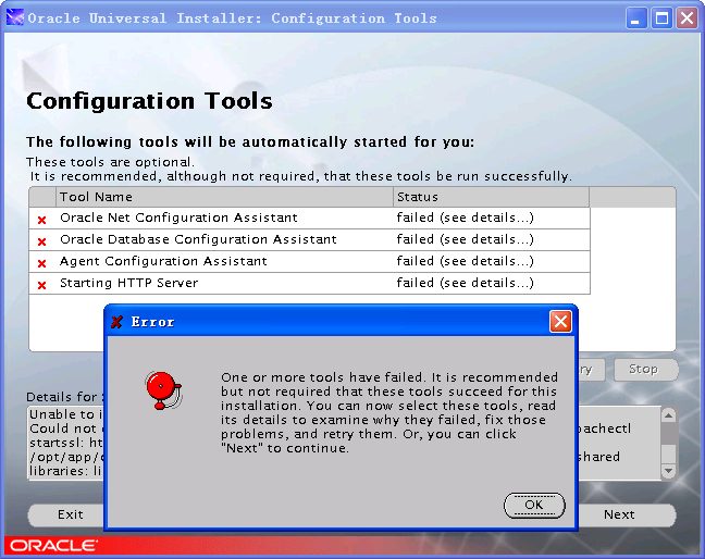 上述工作完成后,点击Oracle安装界面Configuration Tools部分,从上往下点击各项“Retry”: