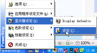 打开PowerStrip后,点击右下角的按钮,选择“显示器设定”——“设定”: