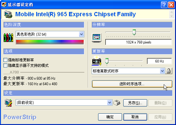 我使用的是最新版PowerStrip v3.86 Final,较老的版本似乎不支持945G显卡。并且该版本提供的屏幕调整位置调整功能,在实际使用时似乎也没什么效果。突发奇想,想起以前在老式显示器上经常出现刷新率太高不能显示的问题,故试试调整屏幕刷新率。60Hz以上屏幕直接没有显示,用PowerStrip降低到50Hz,屏幕满屏完美呈现出来。