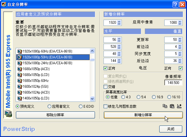 最后,在“预定义分辨率”中寻找“1920x1080p 50Hz”一项,并点击右下方的“新增分辨率”: