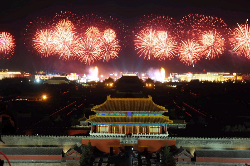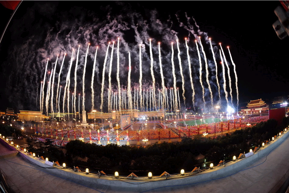 烟花在天安门上空绘出“60”图案: