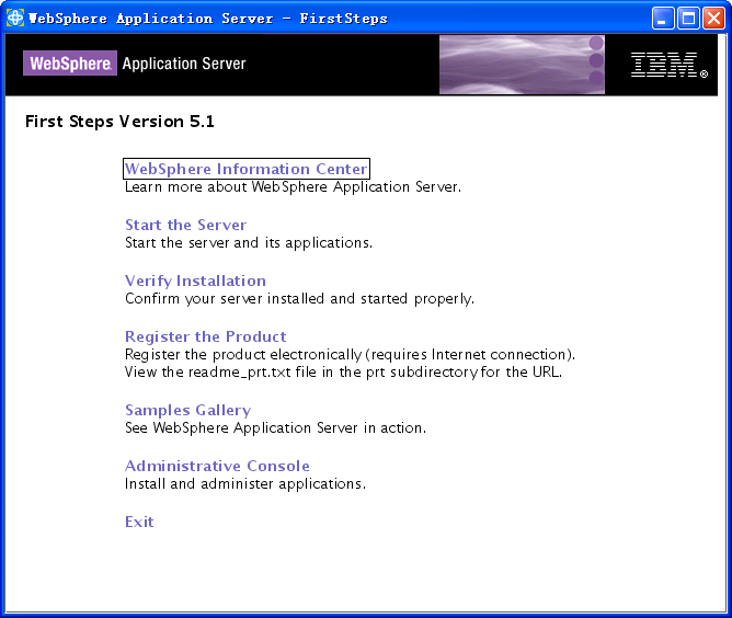 安装完成后,会自动启动一个First Steps 向导窗口,从这里可启动、停止或检查WAS。