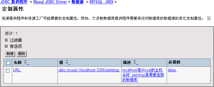 上篇日志中,经配置后,最终在“JDBC 提供程序”—“Mysql JDBC Driver”—“数据源”—“MYSQL_JNDI”—“定制属性”中的配置如下:
