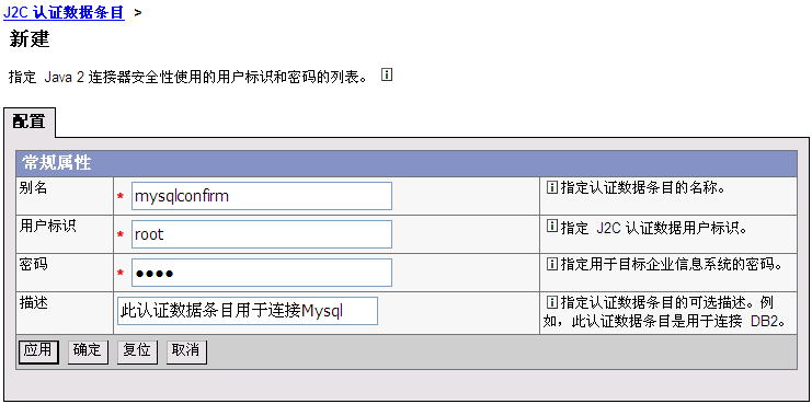从树状菜单中,选择“安全性”——“JASS配置”——“J2C 认证数据”——“新建”,输入以下信息: