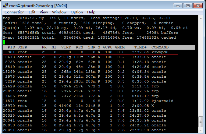 从系统top命令发现,oracle的申请的虚拟内存是29.4G(接近30000M),而Oracle启动后,多个oracle进程的常驻内存在不断的增加,故怀疑其使用的并不是SGA申请的内存: