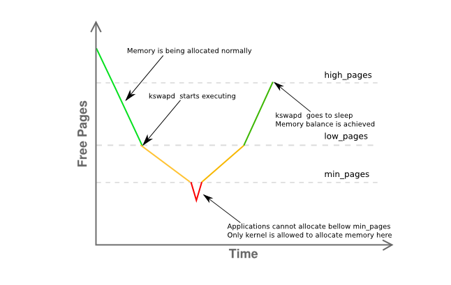 该值不应该太大,太大了,其他应用可用的内存就会减少,提高kswapd交换的频率;也不应该太小,太小了,供核心调度的内存范围将不足,可能会因内存不够,发生OOM。该值与kswapd等存在以下关系: