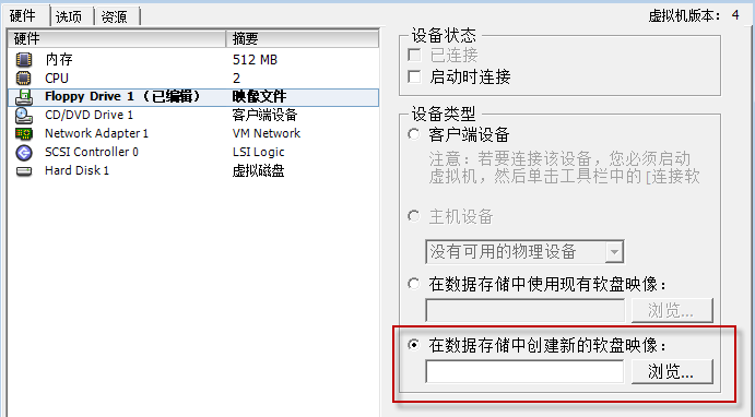 由于.flp 格式特有,我们只能利用Vmware 来创建。在VMware Infrastructure Client中编辑虚拟机,在Floppy Driver 设备中,选择“在数据存储中创建新的软盘映像”: