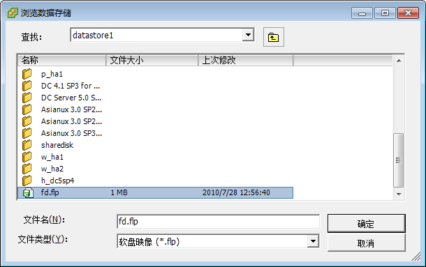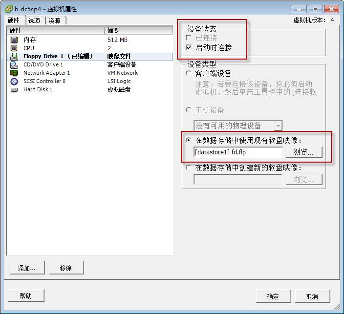 然后,在“在数据存储中使用现有的软盘映像”选择刚创建的软盘映像: