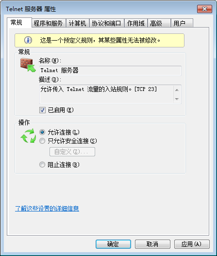 打开“控制面板”——“系统安全”——“Windows 防火墙”——“高级设置”,点击“入站规则”,右键点击“Telnet 服务器”,选择“属性”,在弹出的窗口中配置即可: