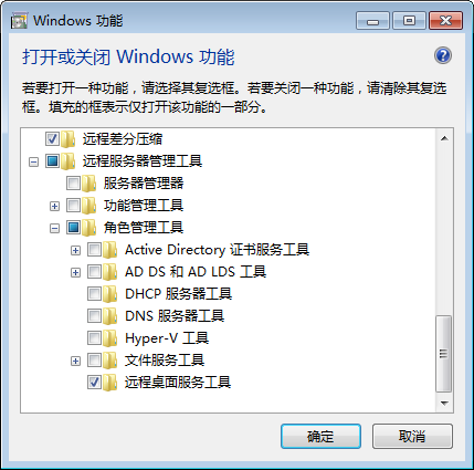 安装完毕后,依次打开:“控制面板”-“程序和功能”-“打开或关闭Windows功能”-“远程服务器管理工具”-“角色管理工具”,勾选下面的“远程桌面服务工具”: