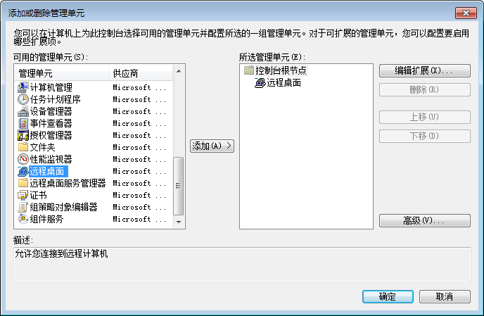 在打开的控制台界面,从菜单中选择“文件”-“添加或删除管理单元”,然后从“可用的管理单元”添加“远程桌面”到“所选的管理单元”中,点击“确定”: