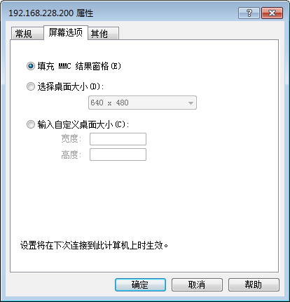创建连接后,右键点击该连接,选择“属性”,在“屏幕选项”中可设置分别率: