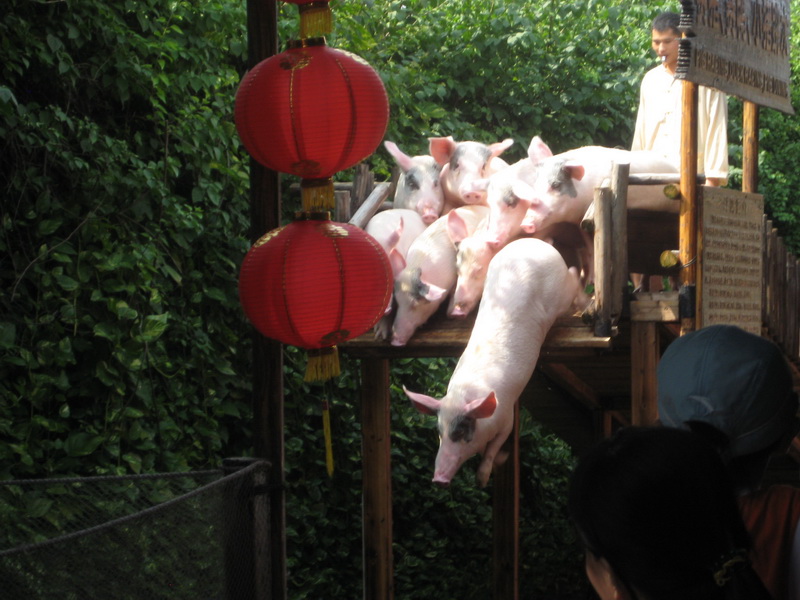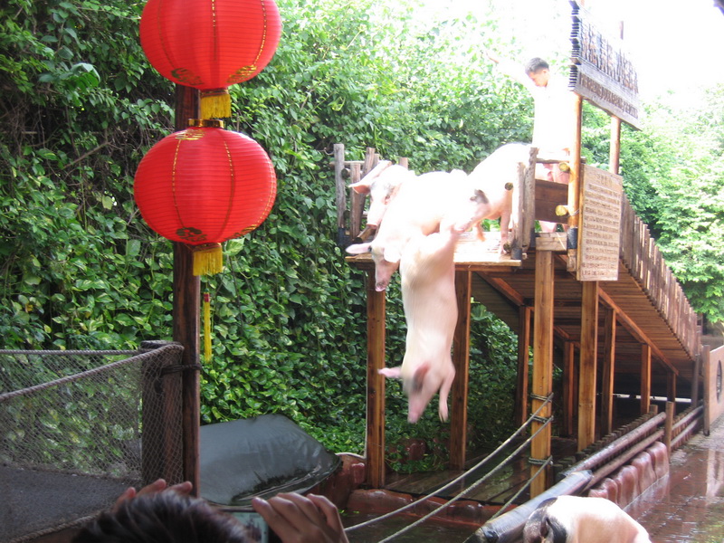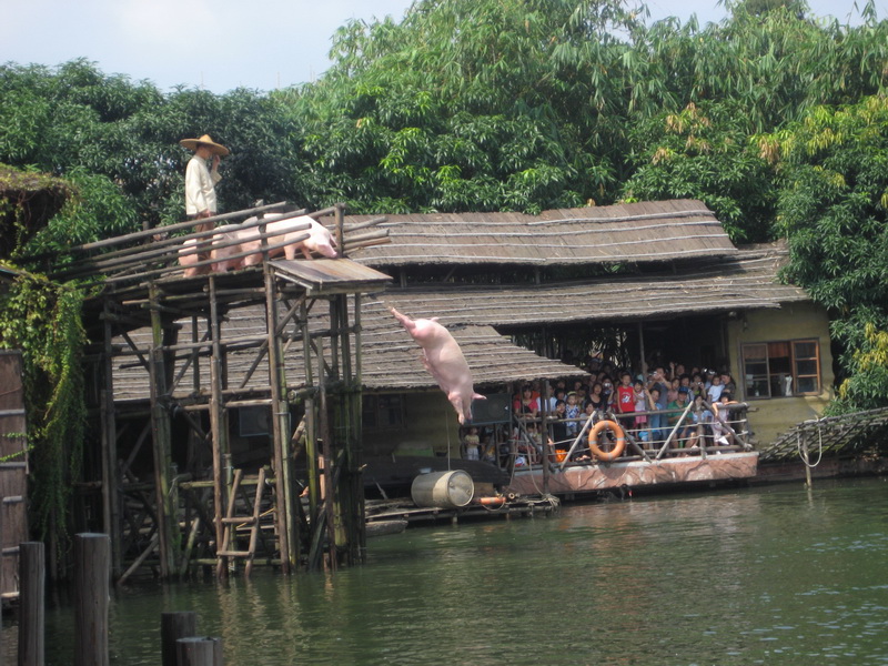 推荐到草坪附近看大笨猪跳水,农家无绝:斗鸡、小猪跳水、赛鸭,皮影戏等节目(留意演出时间)。在大门口湖畔广场及附近的cosplay 卡通表演、民族艺术展示等也是个惊喜,特适合小孩。这次,可惜没有时间去观看海陆空动物表演(人太多),不知道情况如何。