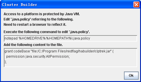 如果您忘了编写.java.policy,在新版本中,启动配置工具时,会自动弹出提示信息,参考该信息编写文件即可: