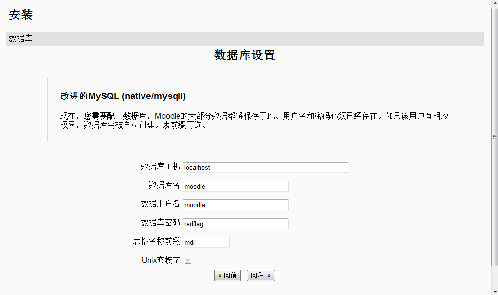 这里把数据库默认编码设定为UTF-8,用户名:moodle,密码是:redflag。