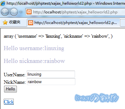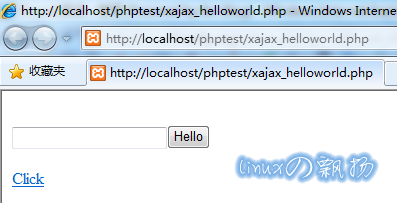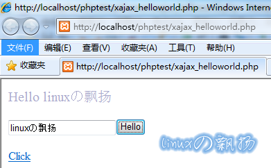 输入内容后,点击“Hello”按钮,或“Click”链接后,产生的异步刷新页面: