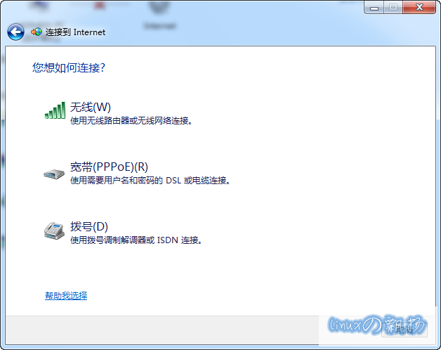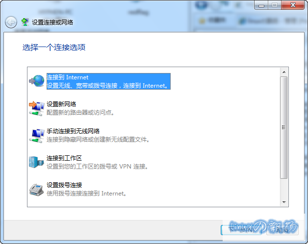 在控制面板\网络和 Internet\网络和共享中心,选择“设置新的连接或网络”,点击“连接到Internet”: