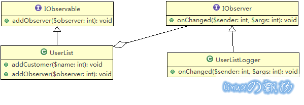 这里,IObservable 接口定义了成员方法 addObserver()来增加观察者对象,UseList类是用来实现IObservable 接口的,UserList 类主要是关注可观察的对象。当可观察的对象更改时,它就会将消息发送到已注册的观察者。IObserver 接口定义了成员方法onChange() 类实现更新功能,类UserListLogger() 用来实现IObserver 接口,在得到UserList 类发送的更改消息后就更新自己。