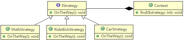 这里,Context 类中定义了一个成员方法find(),该方法的功能是用来选择具体使用哪个策略。这些策略的功能由IStrategy 接口定义,并且该接口有3个实现分别为:类WalkStrategy、类RideBickStrategy 和类CarStrategy。