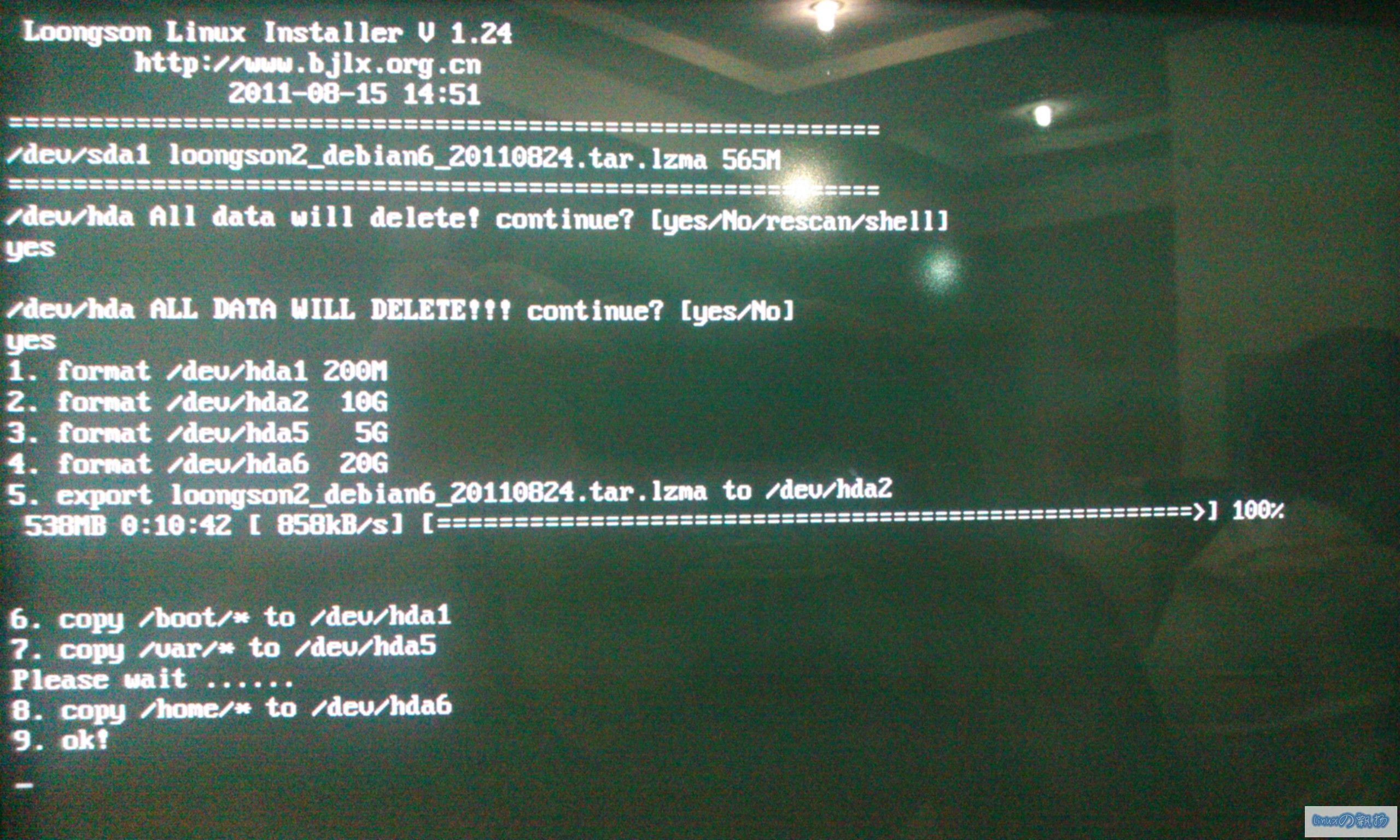 根据安装说明,我选择的是pmon命令行方式,在引导时,看到提示按Del 键进入pmon模式,即按Del 键(非常奇怪,若在开机后即按Del 键,机器引导会停止在检测USB键盘的位置,无法继续)。
