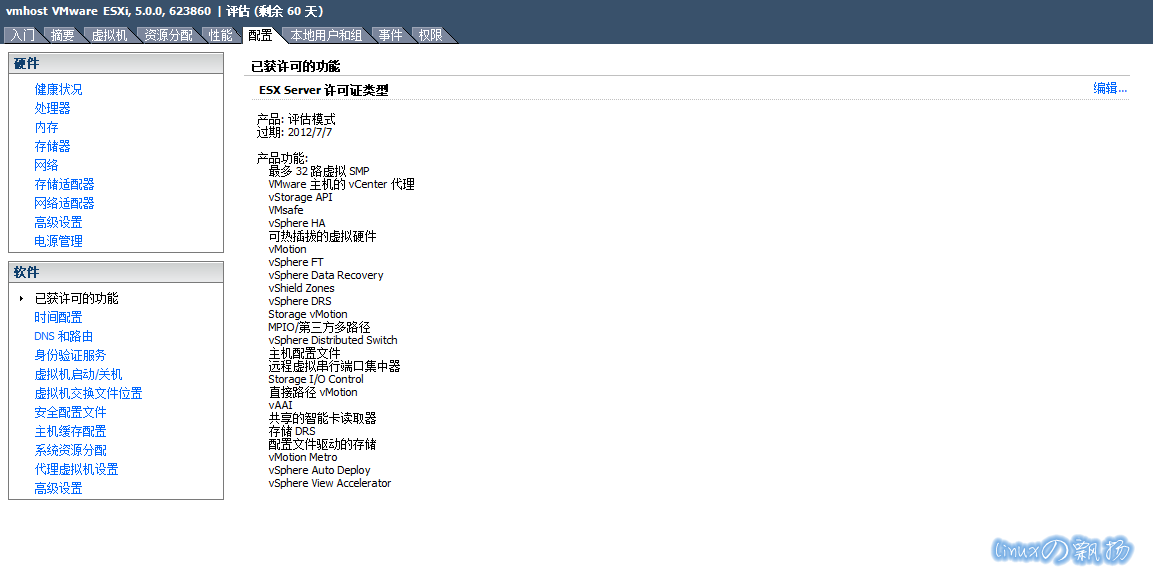 点击左边栏的主机IP,在主界面选择“配置”页,并在下面“软件”部分,选中“已获许可的功能”,这是评估许可: