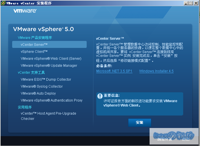 正如下面所显示的,vCenter依赖于两个软件包:Microsoft .Net 3.5 SP1 和 Windows Install 4.5: