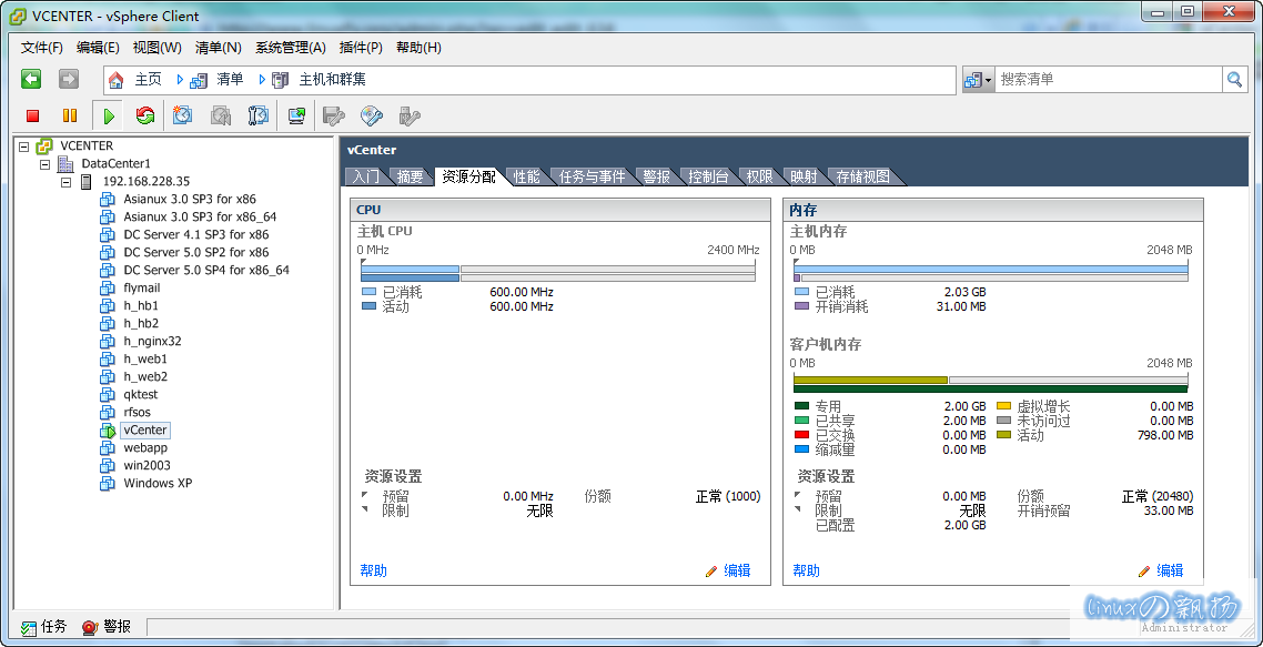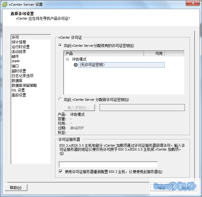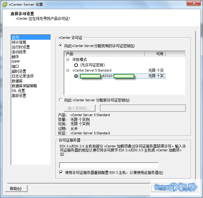 点击菜单“系统管理”——“vCenter Server 设置”,在“许可”栏,可看到当前的许可信息: