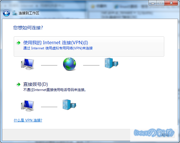 Windows 系统自带PPTP客户端,打开“控制面板”——“网络和Internet”——“网络和共享中心”。在“更改网络设置”部分,点击“设置新的连接或网络”,在弹出窗口中,选择“连接到工作区”: