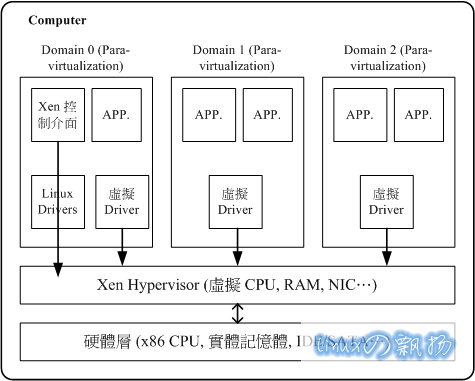 Xen 分成多个层级来执行。他将 Linux 的核心修改过后,再使用这个修改过后的核心开机,而开机后先载入 Xen 的监督器 (Hypervisor), 并且启动第一个管理操作系统,我们称他为 domain-0。 (在 Xen 上面所谓的一个 domain 就是一个虚拟机!),简称Dom0。