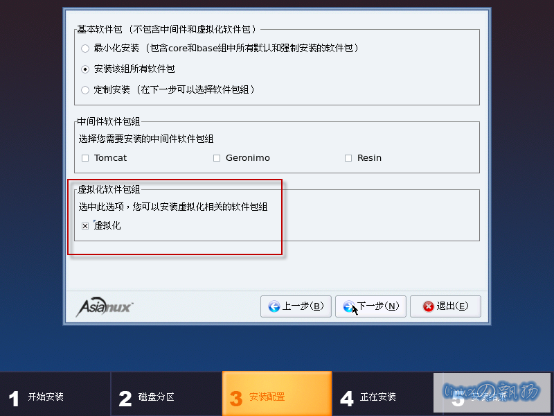 红旗Asinuax 3.0提供Xen 虚拟化支持,只要在进行操作系统安装时,在“自定义软件包”部分,把“虚拟化软件包组”中的“虚拟化”选中即可,如图: