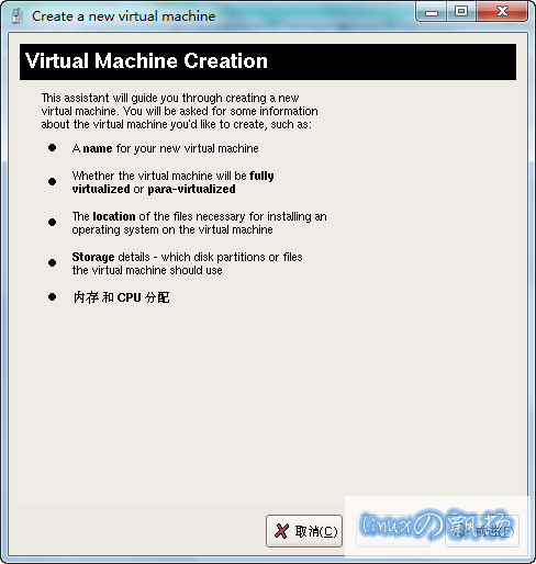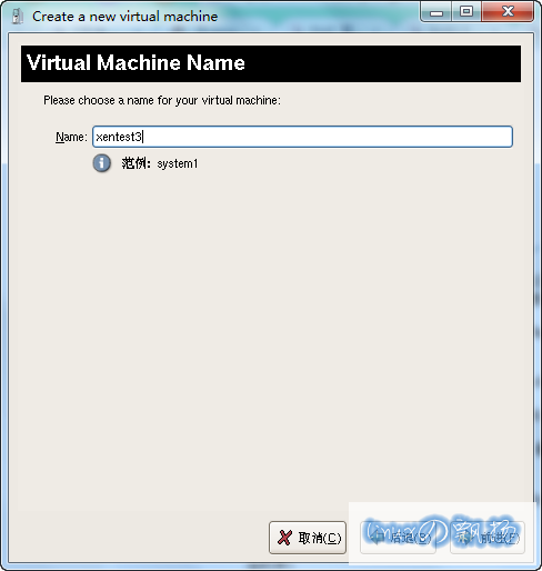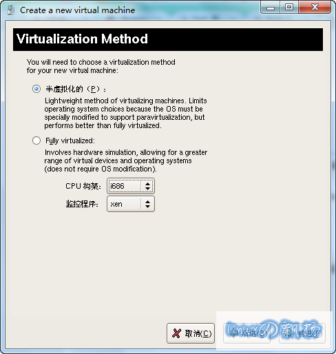 有两种虚拟化类型:qemu 和 xen,并可见到已经存在一个Domain-0。选择“xen”一行,然后点击下面的“新建”,会显示向导界面: