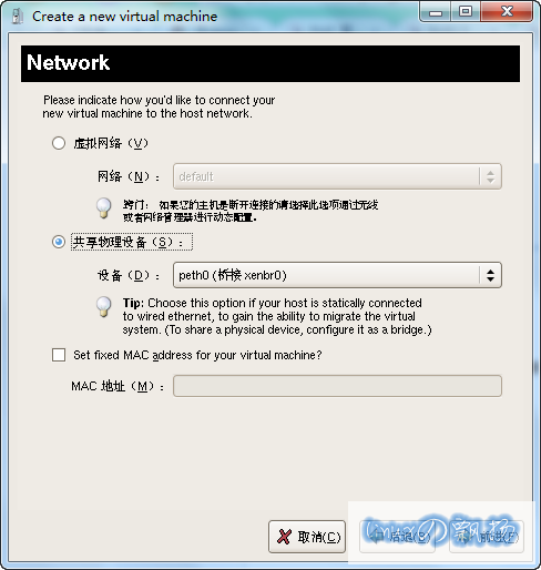 网络配置,可使用虚拟机内部网络,或共享硬件设备的网卡peth0(桥接xenbr0):