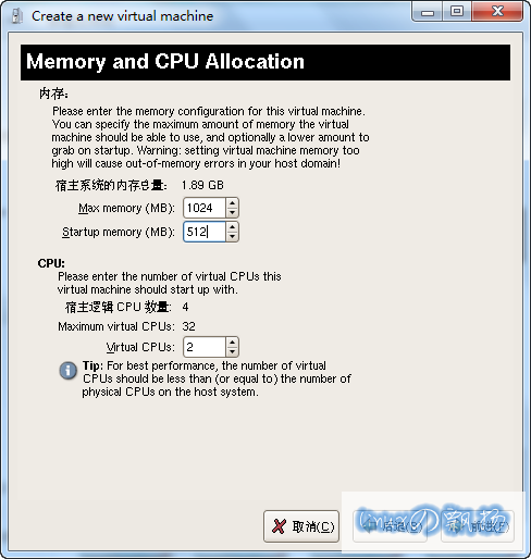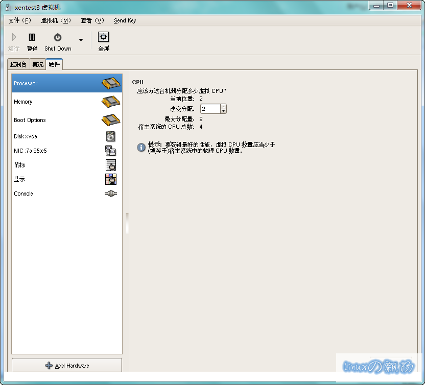 内存和虚拟CPU 数量,各虚拟机(包括Domain-0)合计的内存不能大于硬件的物理内存,CPU 合计建议不要超过逻辑CPU 的数量: