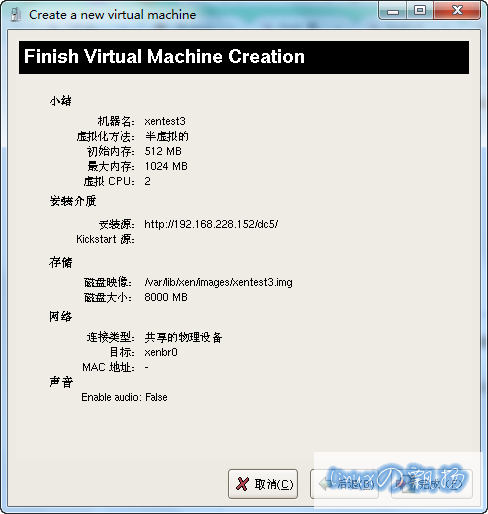 一切顺利的话,就可以开始安装虚拟机系统,即DomU。这可通过virt-install 命令行,或virt-manager 虚拟系统管理器界面进行安装。这里,以图形工具为例,运行: