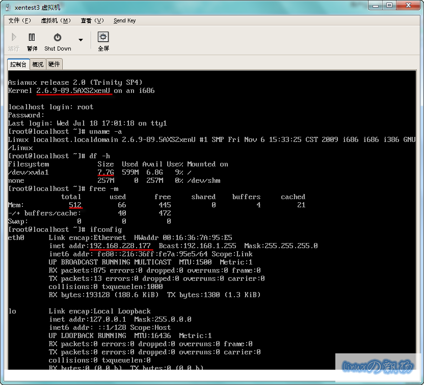 登陆系统,请留意核心,以及网卡是桥接到外部192.168.228.x 网段的: