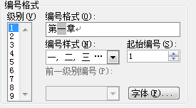 然后,在“编号格式”的“一”前后加上中文,成为“第一章”:
