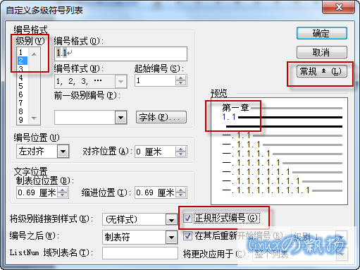 点击右上角的“高级”按钮,然后点击左边的“级别”,选择第“2”级别,接着,把右下方“正规形式编号”选上即可: