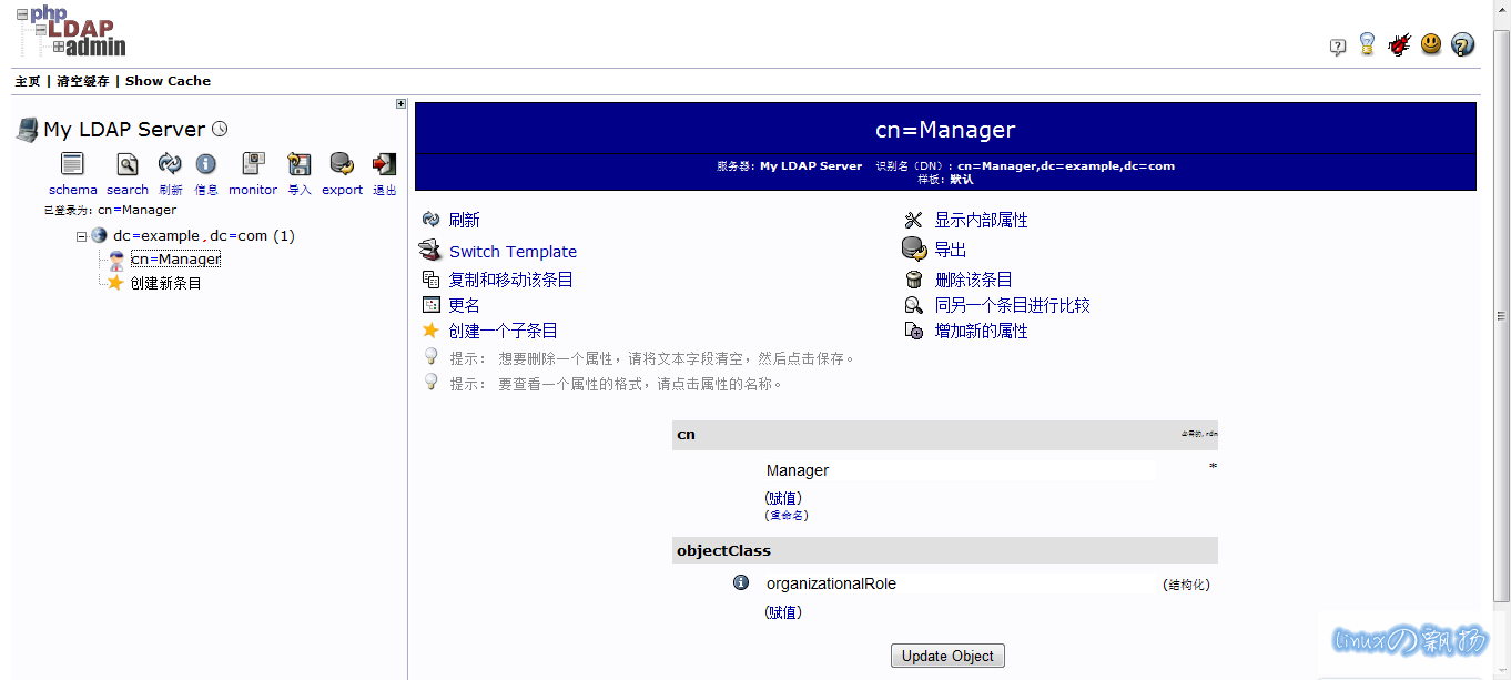输入slapd.conf 配置模板中的rootdn 部分作为登陆DN,rootpw 部分为密码。