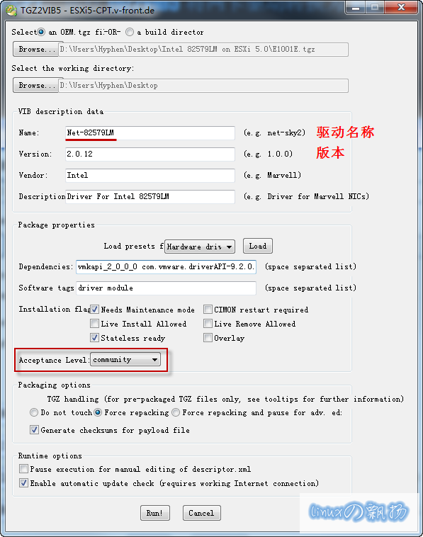 解压或安装ESXi5-CPT-v2.1,运行里面的tgz2vib5.cmd 命令,并填入驱动的相关信息: