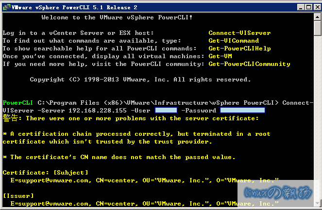 Connect-VIServer -Server 192.168.228.155 -User hyphen -Password xxxxx